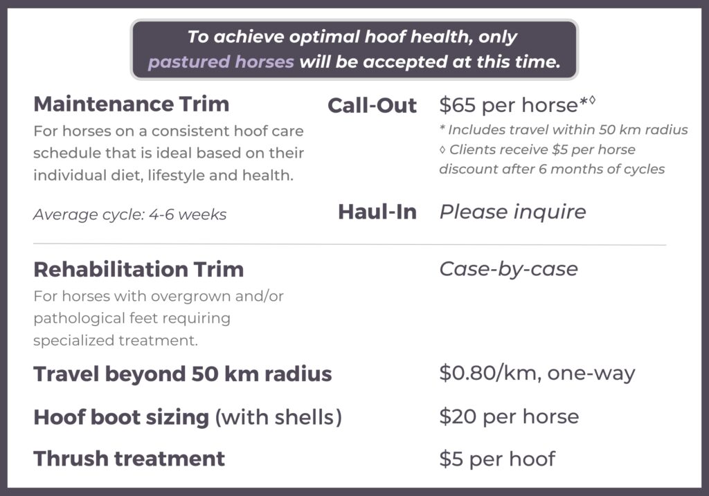 The key to optimal hoof health lies beyond any trim. The diet and lifestyle of a horse often plays an even bigger role in creating strong, healthy hooves. I discuss these vital topics with all of my clients.